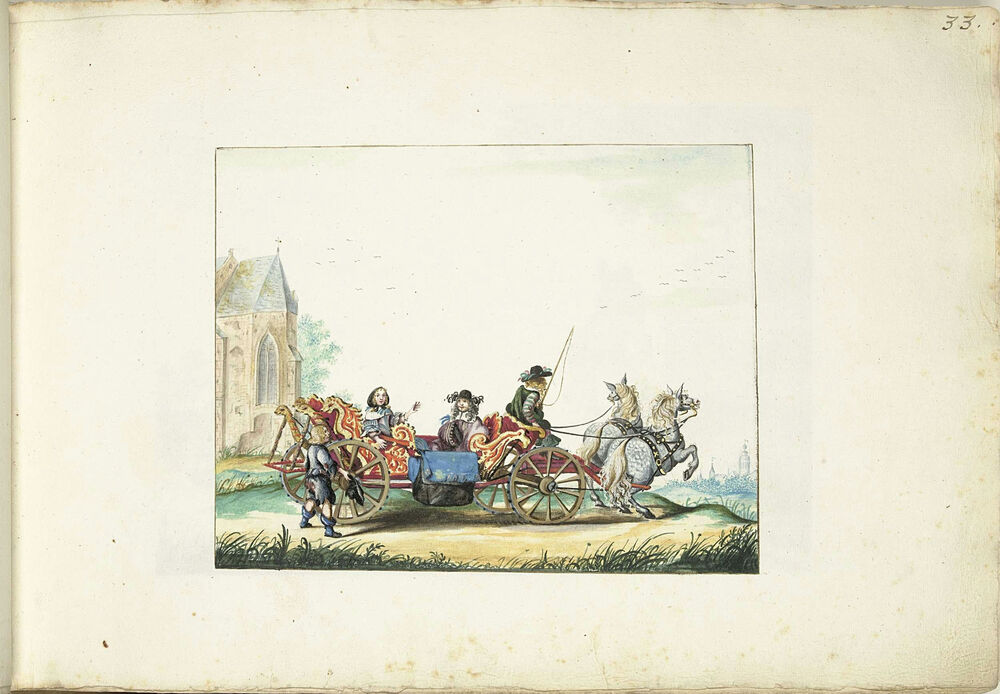 Jongetje bedelend bij de koets van een elegant paar
