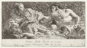 A bearded, seated man looks over his right shoulder toward a child and woman bearing a vessel, possibly a variation on a theme of Armida and Adraste from 'Jerusalem delivered' (Gerusalemme liberata)
